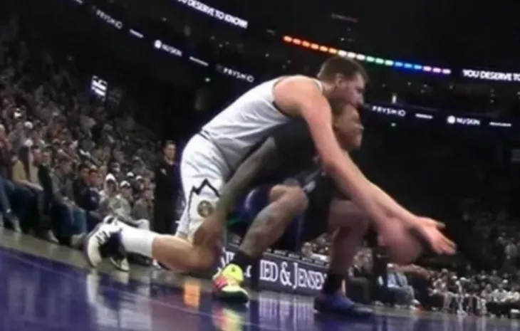 比赛的第二节中,约基奇拼抢球时压在基扬特-乔治身上,后者表情痛苦。